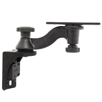 RAM Flat Surface Horizontal Single Swing Arm Mount. 6" long BENT swing arm mounted on a horizontal surface mounting base. At the device mounting end of the mount is a rectangular 6.25" x 2" plate. There are two (2) pivoting points on the mount. One at the swing arm and base and one at the center of the rectangular plate and the end of the swing arm. Each pivoting point allows a complete 360 degree rotation