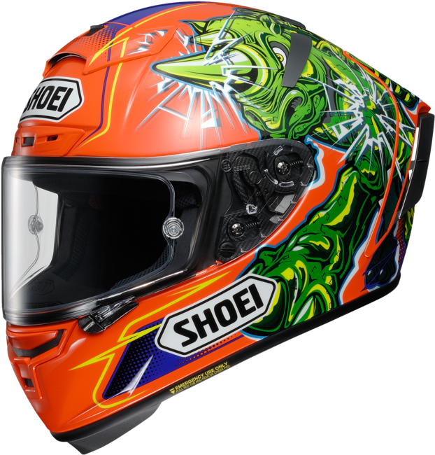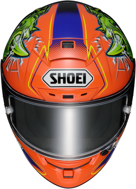 Design concept\nBorn in SHOEIs state-of-the-art wind tunnel, the X-Fourteens aerodynamic profile has been meticulously crafted to enhance high-speed stability while reducing drag and the negative forces that can inhibit a riders performance on race day. Developed using rider input from the worlds top road racing athletes like Marc Marquez and Bradley Smith, careful consideration was given to every detail of the new X-Fourteen.\n\nVentilation performance\nRacing environments can be extremely hot and fatiguing, which is precisely why next-level ventilation performance was a top priority when SHOEI engineers conceptualized the X-Fourteen. Boasting six (6) air intakes and six (6) exhaust outletsall strategically shaped and located to maximize airflow and negative air pressure suction to the rear of the helmetthe X-Fourteens ventilating prowess is second to none. The X-Fourteens all-new cheek pad cooling system delivers refreshing air to the riders cheek area thanks to channels cut through the EPS liner and corresponding air holes located in the cheek pad foam.\n\nCWR-F Race shield\nThe X-Fourteens CWR-F race shield provides a vast field of vision that todays top racers demand. In addition to protecting against 99% of the suns damaging UV rays, the CWR-F shield offers a distortion-free view throughout the entire range thanks to SHOEIs 3D injection-molding process. Additionally, innovative ribs on the top and bottom edge of the shield improve rigidity and eliminate the bending effect that may occur from wind pressure during high-speed riding, and the all-new double shield locking mechanism prevents potential unwanted shield openings in the event of an accident. The CWR-F race shield also features SHOEIs exclusive, patent-pending Vortex Generators, which effectively reduce air friction and improve airflow around the helmets surface. \n\nQR-E Base plate\nCoupled with the CWR-F race shield, the X-Fourteens innovative QR-E base plate system facilitates quicker shield changes than ever before. Once a shield is installed, the strengthened spring-loaded base plates pull the shield back against the dual-lip, dual-layered window beading to ensure a wind and waterproof seal with each and every closure. Add to the mix an innovative five-stage adjustment dial that allows fine-tuning the base plates function more precisely than ever, and youre left with the most advanced base plate/shield combination on the market today.